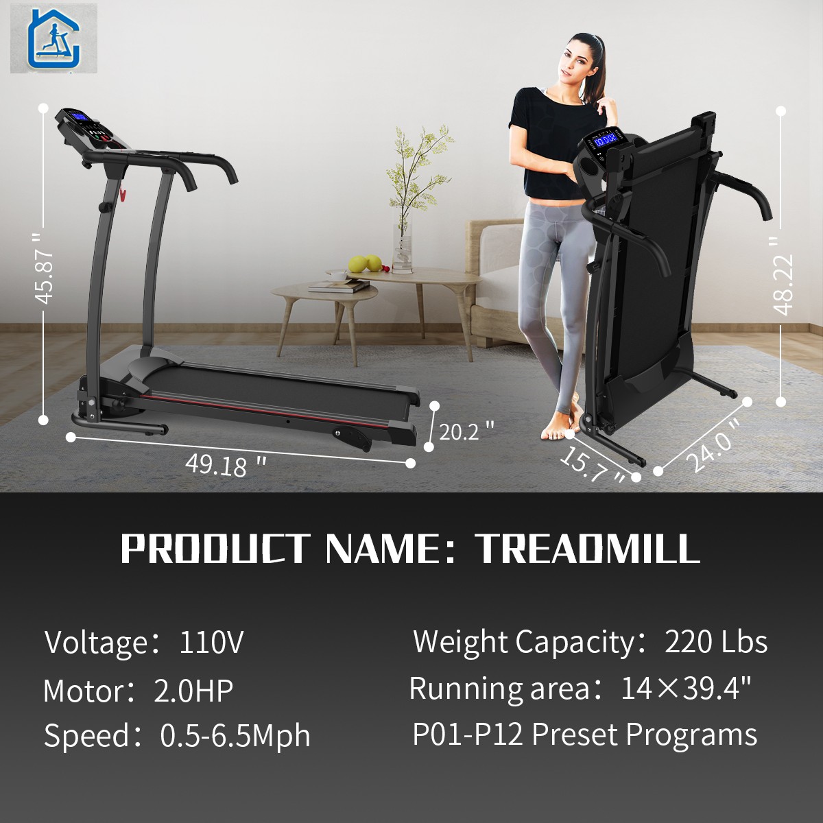 FOLDABLE DESIGN – Easy to store, the portable treadmill can be easily folded up and the folding area is only48.22” x 24.4” x 24.4” ,Weight capacity 55 lbs.With 2 transport wheels for easy storage